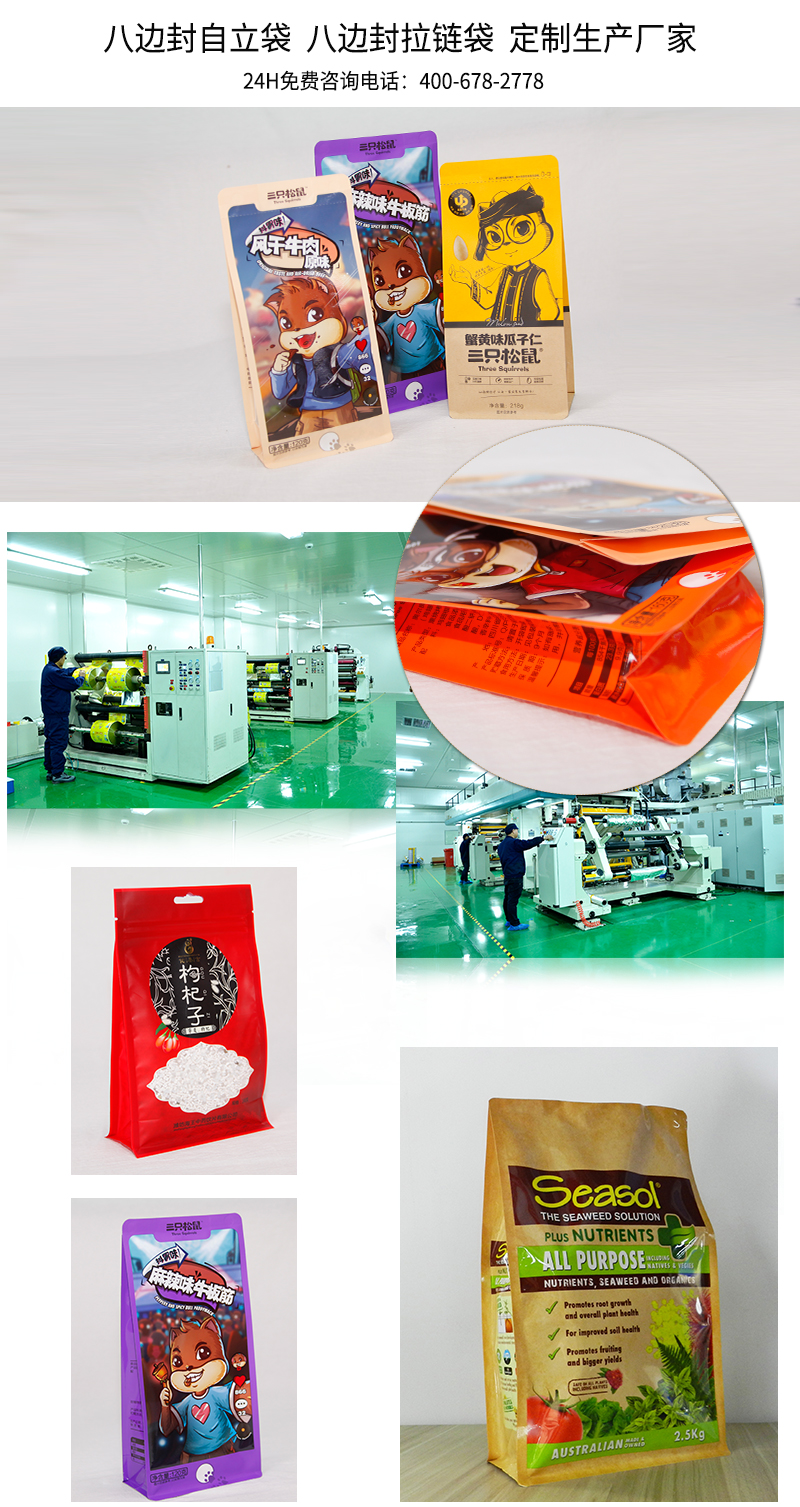 袋型優(yōu)勢(shì):八邊封包裝袋、自立拉鏈袋,即底部四條封邊,(工藝不同底部有時(shí)可能兩條封邊)兩側(cè)各兩條封邊,能夠獨(dú)立站立,內(nèi)部空間大,并且雙側(cè)邊參與印刷圖案,